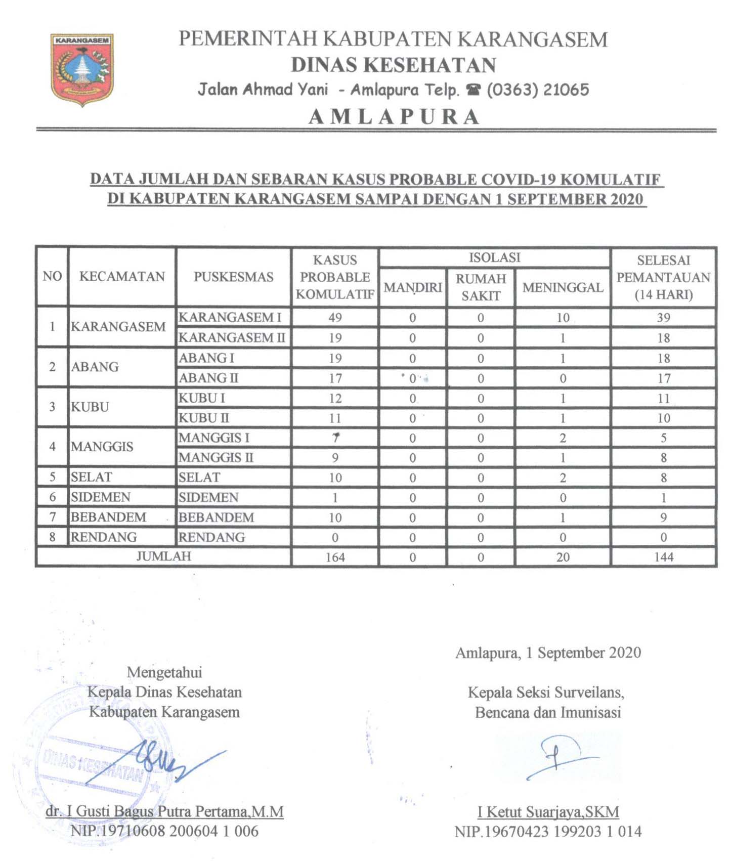 DATA JUMLAH DAN SEBARAN KASUS PROBABLE COVID19 KOMULATIF DI KABUPATEN KARANGASEM