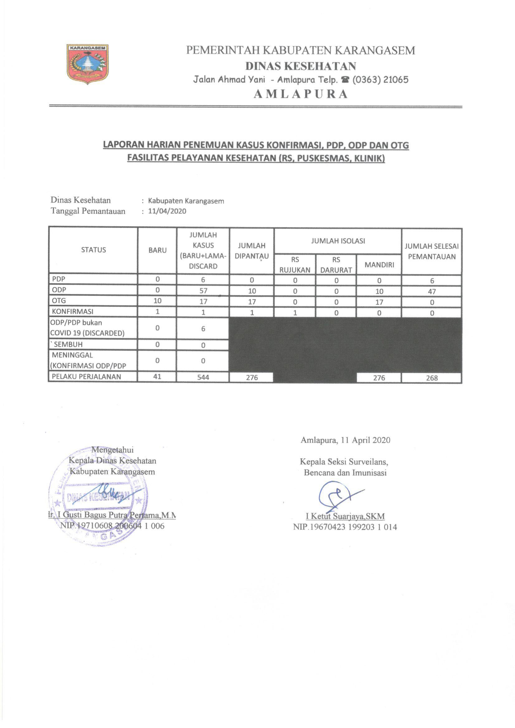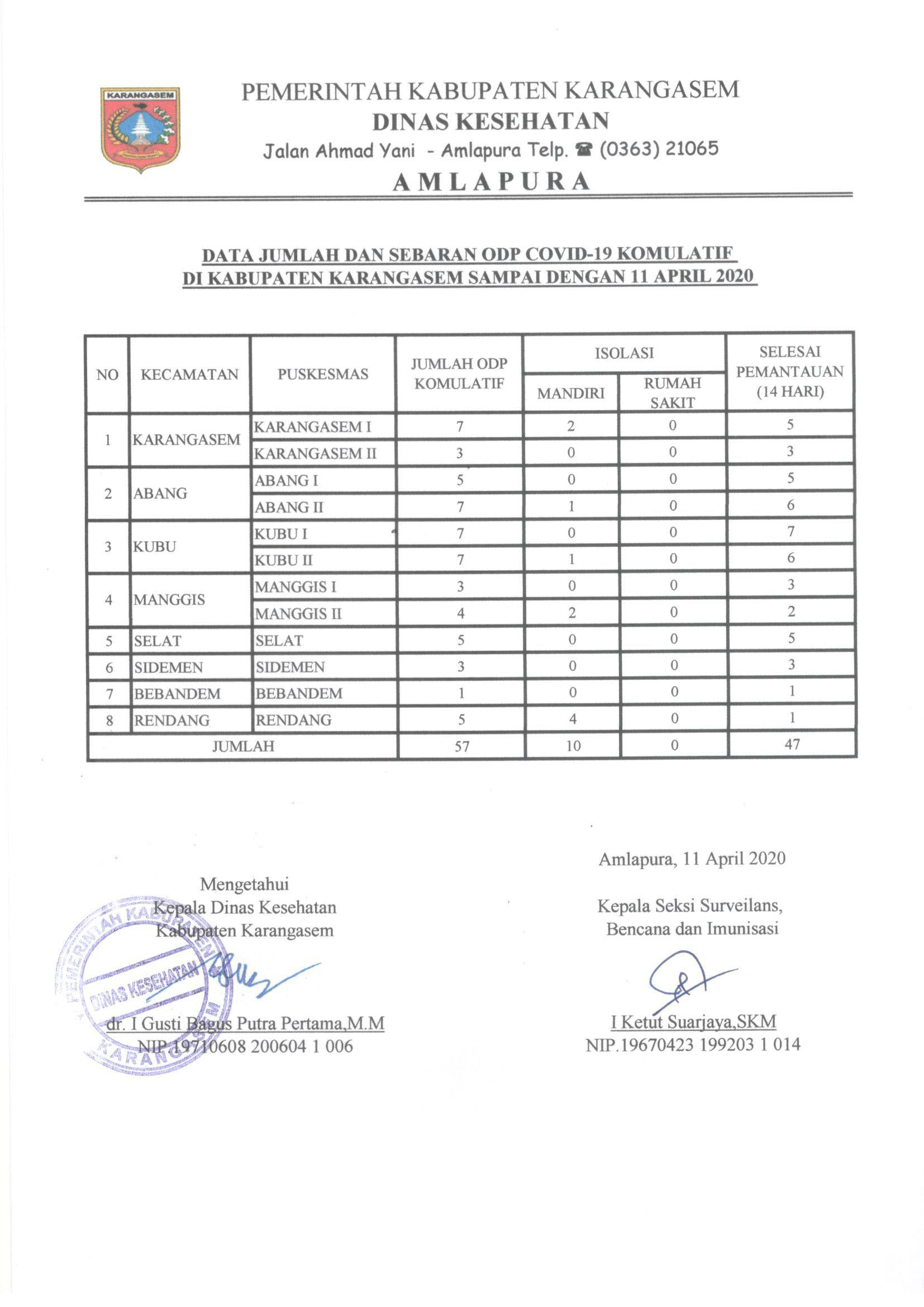 Update Data Kasus COVID 19 di Kabupaten Karangasem 11 April 2020By diskes|2020-04-14T15:22:46+07:00April 11th, 2020|Update Covid19|LAPORAN HARIAN PENEMUAN KASUS KONFIRMASI, PDP, ODP DAN OTG FASILITAS PELAYANAN KESEHATANDATA JUMLAH DAN SEBARAN PDP COVID19 KOMULATIF DI KABUPATEN KARANGASEMDATA JUMLAH DAN SEBARAN ODP COVID19 KOMULATIF DI KABUPATEN KARANGASEMBagikan Tulisan ini!FacebookXLinkedInWhatsAppPinterestEmail Related Posts Update Data Kasus COVID 19 di Kabupaten Karangasem 3 Mei 2021 Update Data Kasus COVID 19 di Kabupaten Karangasem 3 Mei 2021 May 3rd, 2021| 0 Comments Update Data Kasus COVID 19 di Kabupaten Karangasem 30 April 2021 Update Data Kasus COVID 19 di Kabupaten Karangasem 30 April 2021 April 30th, 2021| 0 Comments Update Data Kasus COVID 19 di Kabupaten Karangasem 27 April 2021 Update Data Kasus COVID 19 di Kabupaten Karangasem 27 April 2021 April 27th, 2021| 0 CommentsLeave A Comment Cancel replyComment