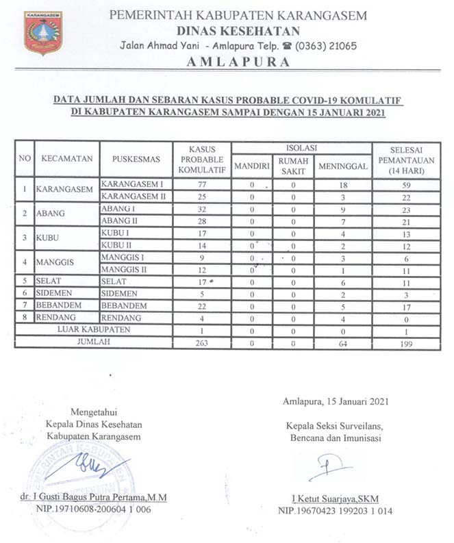 DATA JUMLAH DAN SEBARAN KASUS PROBABLE COVID19 KOMULATIF DI KABUPATEN KARANGASEM