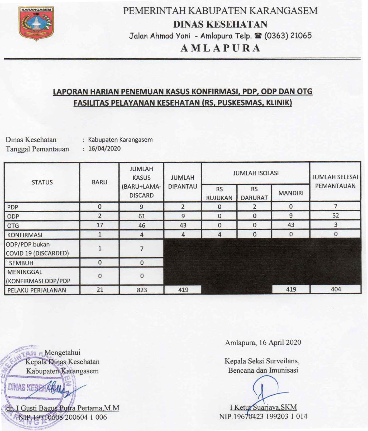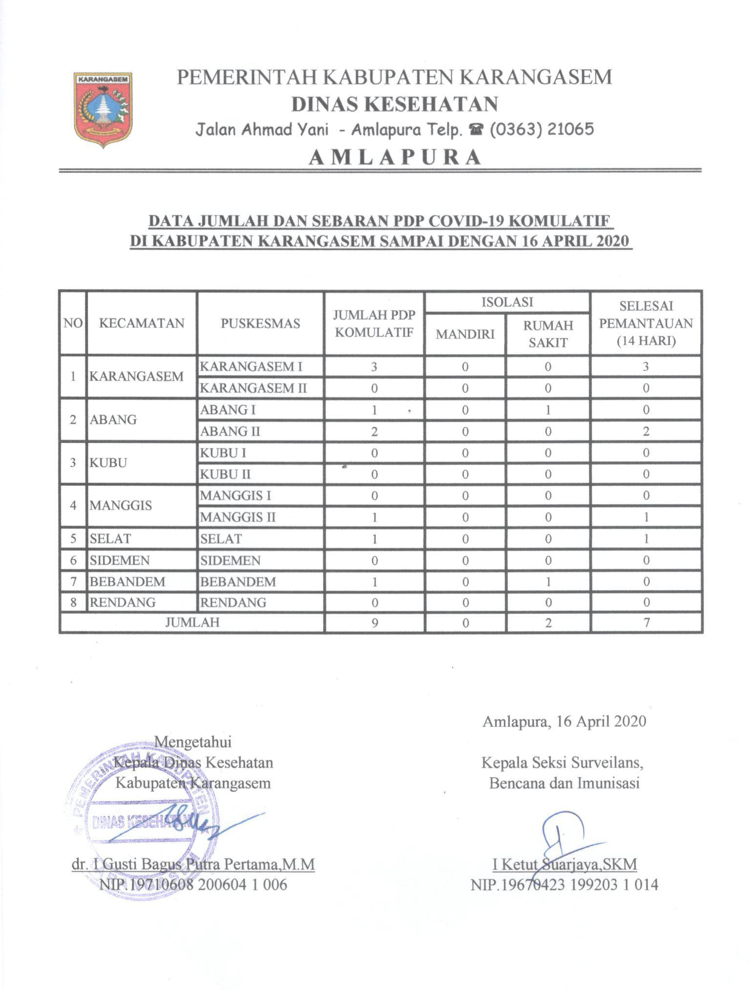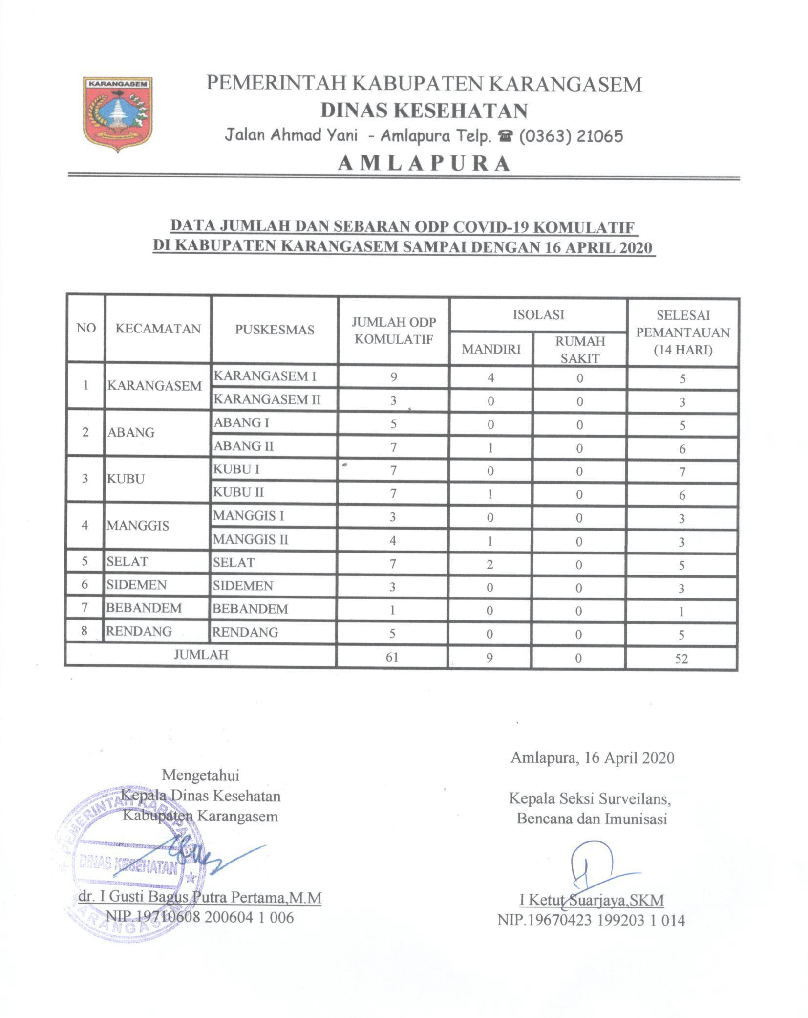 Update Data Kasus COVID 19 di Kabupaten Karangasem 16 April 2020By diskes|2020-04-16T16:20:52+07:00April 16th, 2020|Update Covid19|LAPORAN HARIAN PENEMUAN KASUS KONFIRMASI, PDP, ODP DAN OTG FASILITAS PELAYANAN KESEHATANDATA JUMLAH DAN SEBARAN PDP COVID19 KOMULATIF DI KABUPATEN KARANGASEMDATA JUMLAH DAN SEBARAN ODP COVID19 KOMULATIF DI KABUPATEN KARANGASEMBagikan Tulisan ini!FacebookXLinkedInWhatsAppPinterestEmail Related Posts Update Data Kasus COVID 19 di Kabupaten Karangasem 3 Mei 2021 Update Data Kasus COVID 19 di Kabupaten Karangasem 3 Mei 2021 May 3rd, 2021| 0 Comments Update Data Kasus COVID 19 di Kabupaten Karangasem 30 April 2021 Update Data Kasus COVID 19 di Kabupaten Karangasem 30 April 2021 April 30th, 2021| 0 Comments Update Data Kasus COVID 19 di Kabupaten Karangasem 27 April 2021 Update Data Kasus COVID 19 di Kabupaten Karangasem 27 April 2021 April 27th, 2021| 0 CommentsLeave A Comment Cancel replyComment