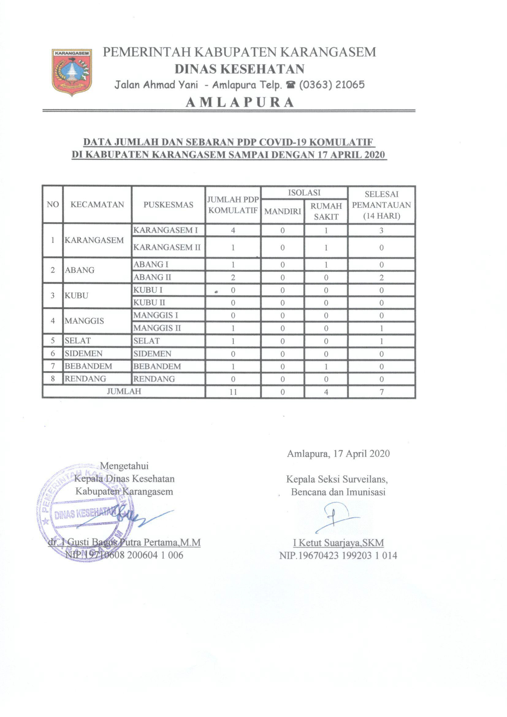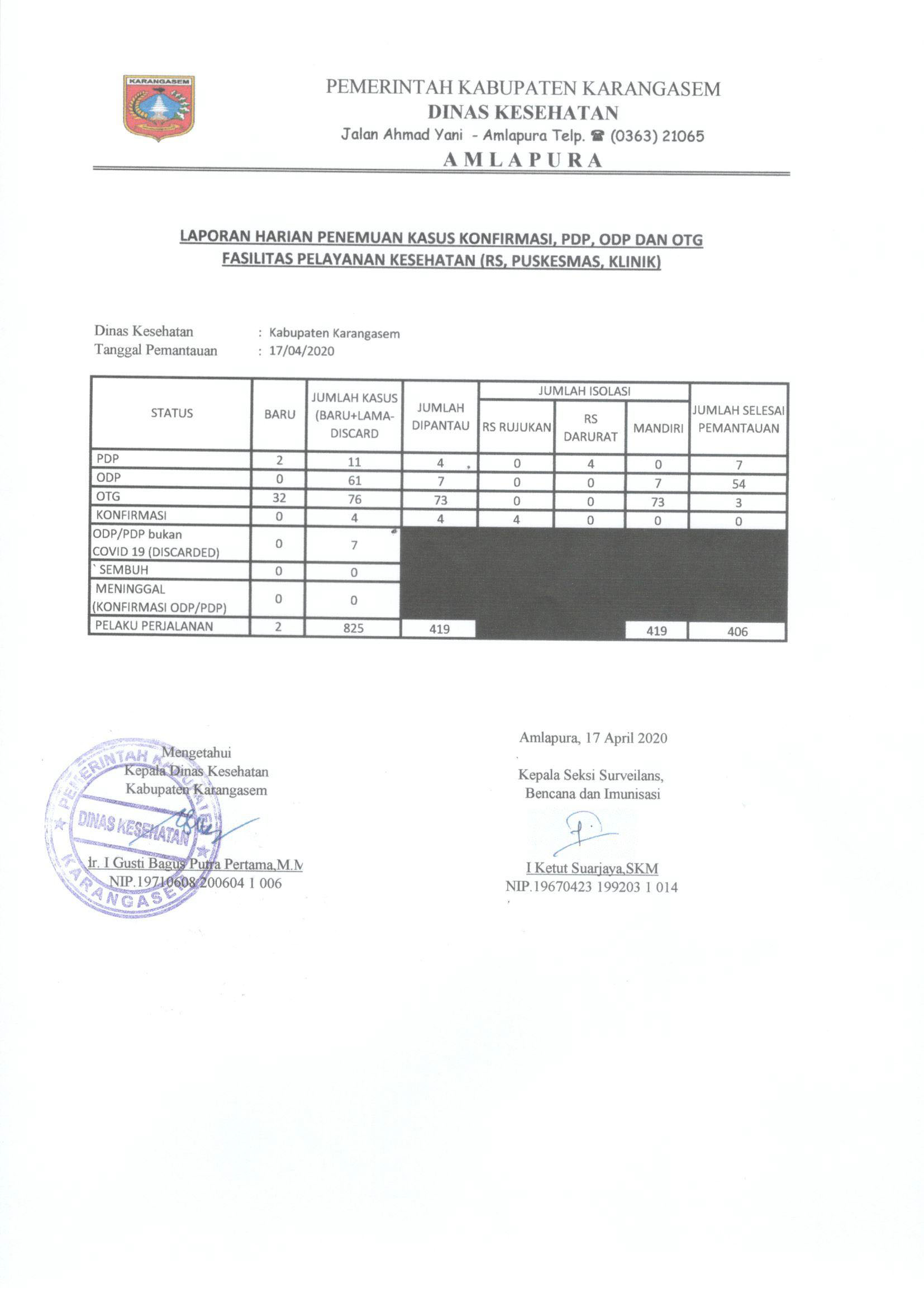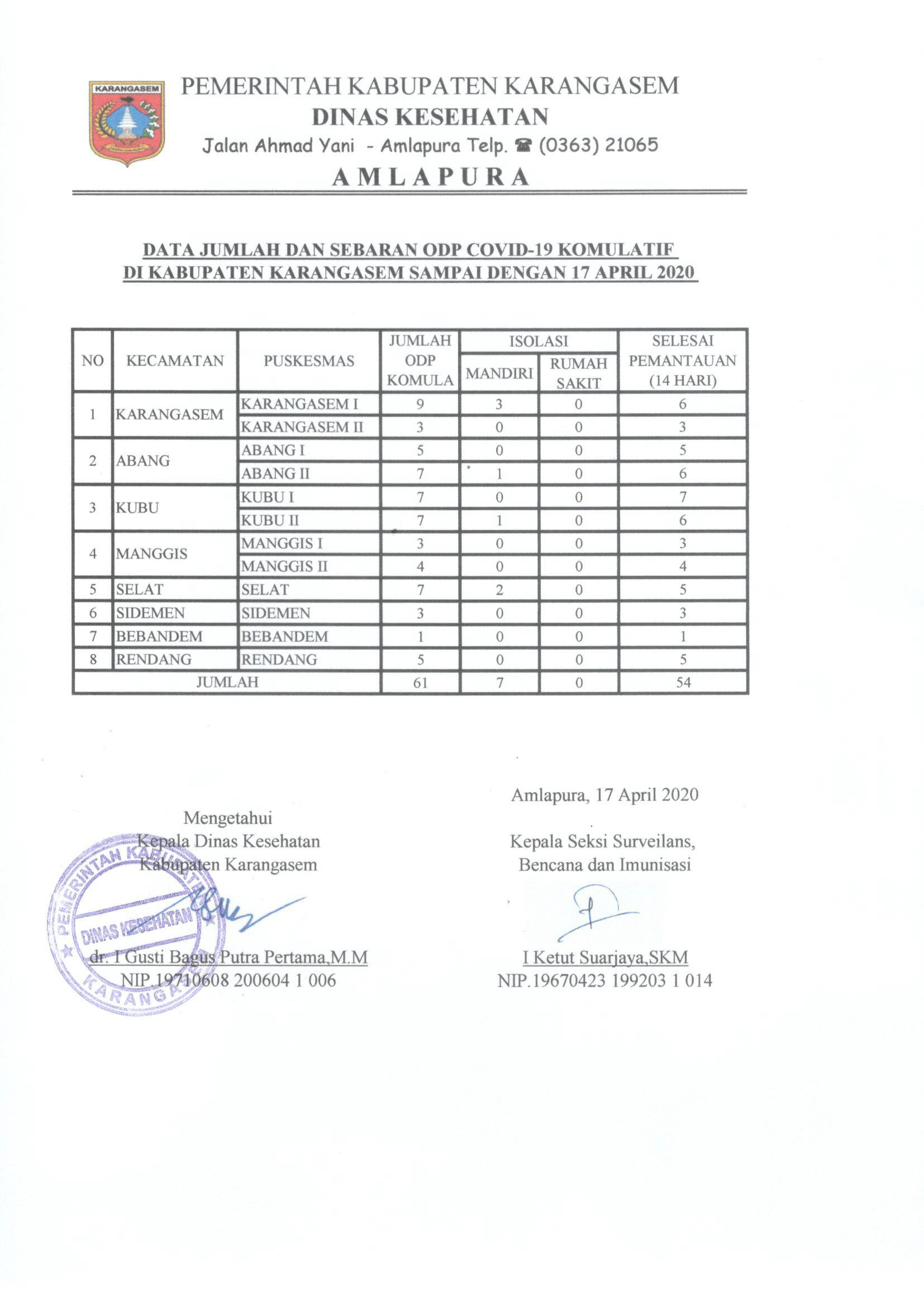 Update Data Kasus COVID 19 di Kabupaten Karangasem 17 April 2020By diskes|2020-04-17T18:23:38+07:00April 17th, 2020|Update Covid19|LAPORAN HARIAN PENEMUAN KASUS KONFIRMASI, PDP, ODP DAN OTG FASILITAS PELAYANAN KESEHATANDATA JUMLAH DAN SEBARAN PDP COVID19 KOMULATIF DI KABUPATEN KARANGASEMDATA JUMLAH DAN SEBARAN ODP COVID19 KOMULATIF DI KABUPATEN KARANGASEMBagikan Tulisan ini!FacebookXLinkedInWhatsAppPinterestEmail Related Posts Update Data Kasus COVID 19 di Kabupaten Karangasem 3 Mei 2021 Update Data Kasus COVID 19 di Kabupaten Karangasem 3 Mei 2021 May 3rd, 2021| 0 Comments Update Data Kasus COVID 19 di Kabupaten Karangasem 30 April 2021 Update Data Kasus COVID 19 di Kabupaten Karangasem 30 April 2021 April 30th, 2021| 0 Comments Update Data Kasus COVID 19 di Kabupaten Karangasem 27 April 2021 Update Data Kasus COVID 19 di Kabupaten Karangasem 27 April 2021 April 27th, 2021| 0 CommentsLeave A Comment Cancel replyComment