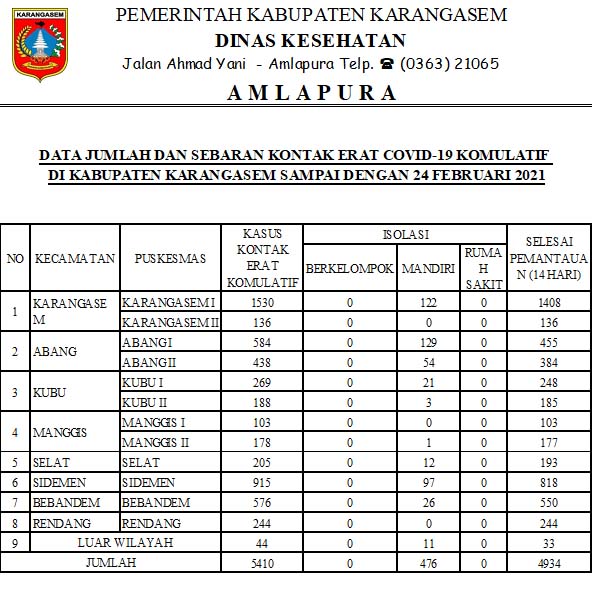 DATA JUMLAH DAN SEBARAN KONTAK ERAT COVID19 KOMULATIF DI KABUPATEN KARANGASEM