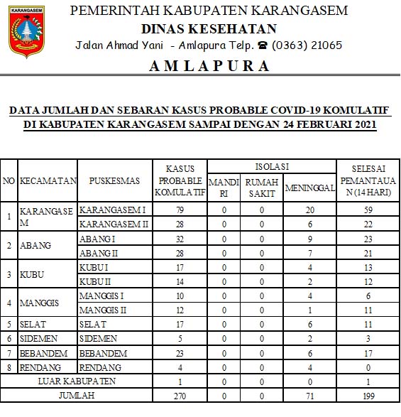 DATA JUMLAH DAN SEBARAN KASUS PROBABLE COVID19 KOMULATIF DI KABUPATEN KARANGASEM