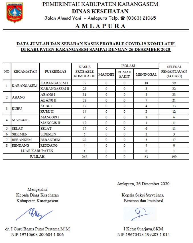 DATA JUMLAH DAN SEBARAN KASUS PROBABLE COVID19 KOMULATIF DI KABUPATEN KARANGASEM