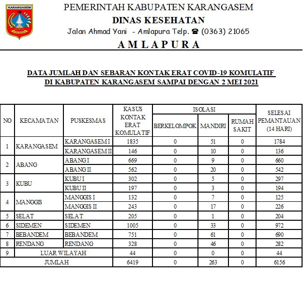 DATA JUMLAH DAN SEBARAN KONTAK ERAT COVID19 KOMULATIF DI KABUPATEN KARANGASEM