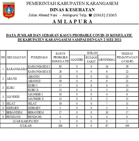 DATA JUMLAH DAN SEBARAN KASUS PROBABLE COVID19 KOMULATIF DI KABUPATEN KARANGASEM